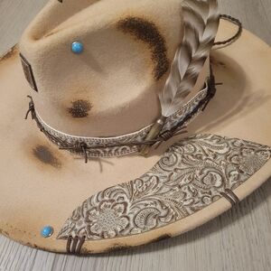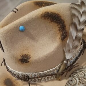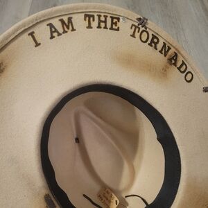 Custom, hand burned, Beth Dutton rancher felt hat. "I AM THE TORNADO" on the underside, with hints of turquoise. This rancher gives gritty & spicy. Hat is adjustable. This particular hat band can not be removed. Will add your initials under the brim or anywhere on hat if you'd like.