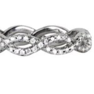 Features pave set brilliant cut simulated diamonds in an infinity inspired setting. Design goes all the way around and is a true eternity band. Total carat weight of 1 carat. Listing is for 1 ring. White gold.