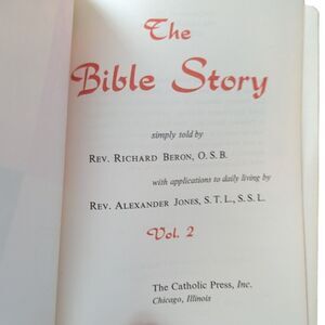This vintage two-volume set of "The Bible Story" is a treasure for any reader interested in Catholic religion and spirituality. The hardcover binding and gold edge pages add to the beauty and durability of this book, which was printed in 1959 by The Catholic Press in Chicago, Illinois.