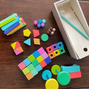 The Lovevery Block Set is Possibly the most comprehensive block set ever designed: Science-based system of 70 heirloom-quality pieces in 18 colors, more than a dozen shapes, and a vast array of solid wood components including arches, wheels, bead threader, and rolling ramp. Can convert into a pull car