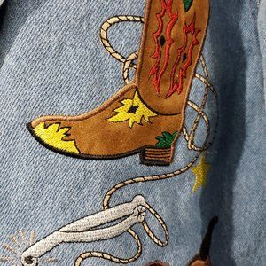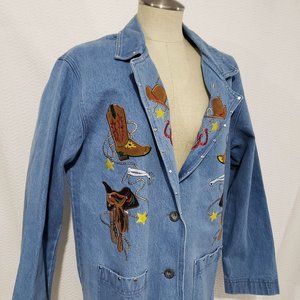 The Blue Denim Women's Jacket Buttons Cowboy Boots Hat Saddle Patchwork M