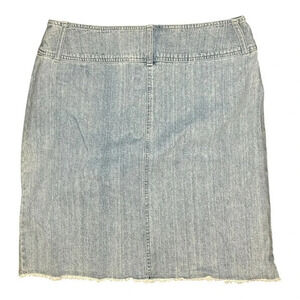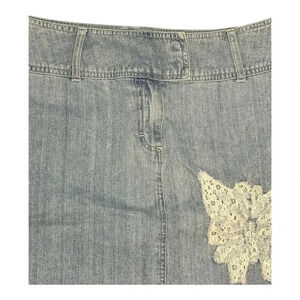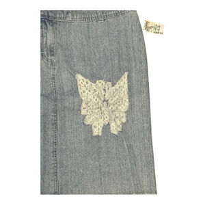 Add a touch of charm to your wardrobe with this light wash denim skirt by The Blues. This stylish piece features a beautiful lace butterfly appliqué and a trendy frayed hem for a casual, chic look. Made from 100% cotton, it’s perfect for comfortable all-day wear. New with tags, size 16.