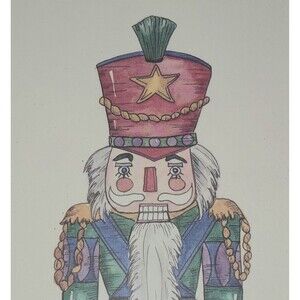 Features a colorful drumming nutcracker on a white background with a border of holly at the edges