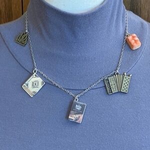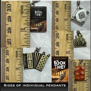 This unisex mixed metal necklace features (from right to left), first, a bronze fire charm, for the book burnings in Nazi Germany, which symbolize the power that words can have. Next is a silver book tome pendant, for the way Liesel's love of books fuels her intellectual development. In the center is a book cover pendant. To the right is a bronze accordion pendant, since Hans's accordion and the music he makes provide comfort for the characters and a respite from the troubled times. Last is a resin charm of a loaf of bread, since the gift of bread symbolizes the kindness and selflessness that people are capable of. This unisex necklace has been newly handmade just for you, and is adjustable from 17.5 to 28 inches (can be made shorter or longer upon request).