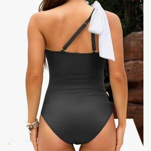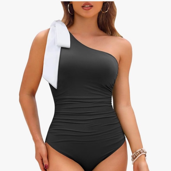 One Shoulder One Piece Swimsuit: The one-piece swimsuit features a one-shoulder design with a unique bow in white , giving it a chic charm.
