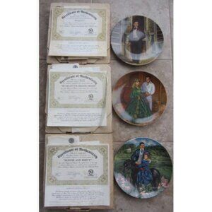 This listing is for 3 "Gone with the Wind" collector plates by The Edwin M. Knowles China Co. sold by The Bradford Exchange. The original box, Certificate of Authenticity, and a pamphlet about the artist is included. The plates are approx. 8.5-inches in diameter. These were purchased through an estate sale several years ago. I do not believe they were ever displayed. There is no tarnish or discoloration. Sorry about the camera glare.