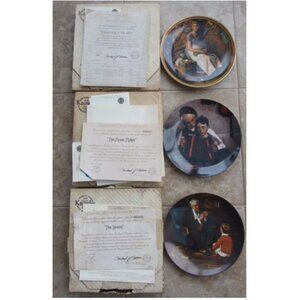 This listing is for 3 Norman Rockwell collector plates by The Edwin M. Knowles China Co. sold by The Bradford Exchange. The original box, Certificate of Authenticity, and a pamphlet about the artist is included. The plates are approx. 8.5-inches in diameter. These were purchased through an estate sale several years ago. I do not believe they were ever displayed. There is no tarnish or discoloration. Sorry about the camera glare.
