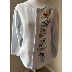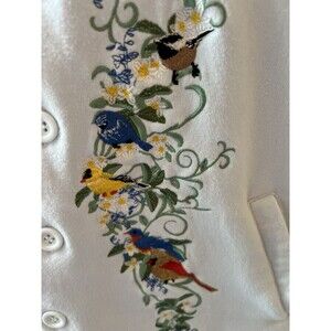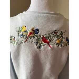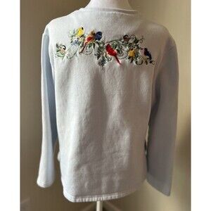 This is a size medium sweater from the brand Bradford Exchange featuring an embroidered bird design, specifically a cardinal, on a light white background. The sweater has a classic fit with a full zip closure and long sleeves, making it suitable for various occasions including travel, casual outings, formal events, workwear, and business attire. Made of a durable blend of polyester and cotton, this heavyweight sweater is machine washable and is ideal for the winter, fall, and spring seasons.