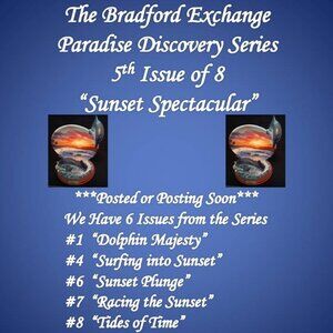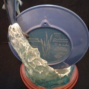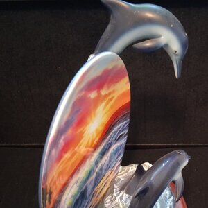 In 2000 the Bradford Exchange Released a series of 8 mounted plates featuring dolphins and sunrises or sunsets, your guess is as good as mine, interwoven with a roaring ocean. Designed by artist Christian Riese Lassen. This is the 5th Issue in the series titled "Sunset Spectacular". The plate depicts an amazing view of the sun over an ocean while 3 dolphins dance in the waves jumping through the air. The dolphins and ocean are part of the base providing a 3D impression. There are a few call outs as the dolphin on the far upper right and forward center has a few scuffs in the paint. The base also has some very minor nicks. The price has been lowered in consideration of these imperfections. We have a total of 6 plates in the series that will be posted soon.
