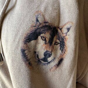 Full zip hoodie with super-soft sherpa lined hood. Beautiful wolf design covers back with additional small design on front chest. No rips, stains, or holes. Excellent condition. Midweight sweatshirt material, very soft and cozy. XXL