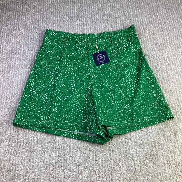 Keywords: The Bubble, Green shorts, White print, Performance shorts, Athletic shorts, Moisture wicking, Breathable, Sun protection, Golf shorts, Casual shorts, Womens shorts, Activewear, Sportswear