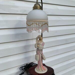 This table lamp from the Crosa Collection features a stunning Art Deco style lady with a white dog. The shade is a white glass dome shape with clear, pink and brown beads. The lady has a pink design dress and has a pink coat w/white fur trim. She has a hat on her head with a feather draping down. There is a white dog in her hands.. The base of lamp is wooden. The cord has a click switch to turn the lamp on/off. It uses a screw in bulb, which is not included. The metal post has some of the gold-tone paint scratched off in some places, that could be touched up with paint. There are no chips or cracks. The wood base measures 9" wide by 8" deep. The lady stands 12 1/2" tall and the lamp is 24 1/2" tall from bottom of base to top part of the metal post.