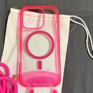 Stylish pink phone case with a convenient straps for easy carrying. Perfect for keeping your phone secure and accessible. For iPhone 16 pro
