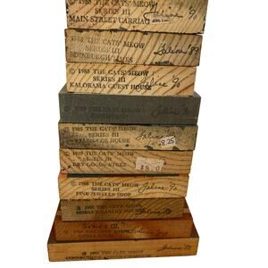 Bring charm and nostalgia to any display with this Cat’s Meow Village Series III Lot of 10 wooden buildings, all dated between 1985–1990 and signed by Faline, the original designer.