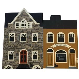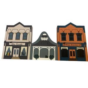 This curated lot includes a wonderful variety of Main Street–style buildings, homes, and specialty shops. Each piece is crafted from solid wood, hand-painted, and features the signature black cat known throughout The Cat’s Meow line.