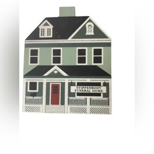 This ¾” thick Stiffenbody Funeral Home is hand screen printed on the front and back. It is part of a ten-piece series of buildings called Series VI, created by Cat’s Meow founder, Faline Jones, in her sixth year of business. This series was introduced in 1988 and retired on December 31, 1993.
