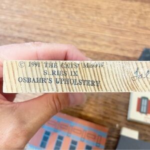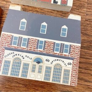 Great vintage condition showing signs of normal use. Does have chipped paint and corners. Please see photos for all details. This is a lot of four wooden, miniature houses. Contains Osbahr Upholstery, Spankys Hardware, the treble clef and clocks, jewelers and gold/ optometrist.