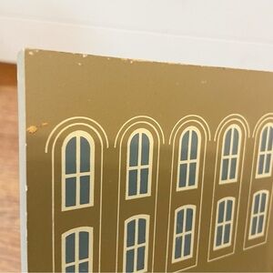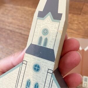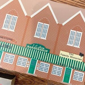 Great condition showing signs of normal use. Does have some chipped paint and some chipped corners. Please see photos for all details. This is a lot of three wooden miniature houses. Contains barbershops/ gallery, Shrimplin & Jones and Immanuel Church.