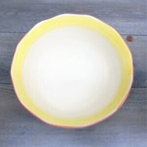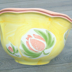 • The bowl is made in Portugal and features a vibrant glossy yellow glaze with hand-painted stylized roses in orange and green. A subtle scalloped rim adds an elegant detail to the piece. This bowl likely belongs to a coordinated serve ware collection with similar floral motifs and color themes.
