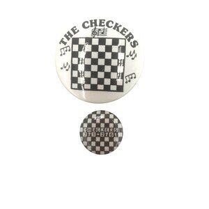 This set of two Checkers button pins showcases a retro music theme with a black and white checkered design. Ideal for collectors, these pins are both stylish and unique, adding a touch of nostalgia to any ensemble or collection.