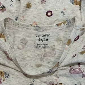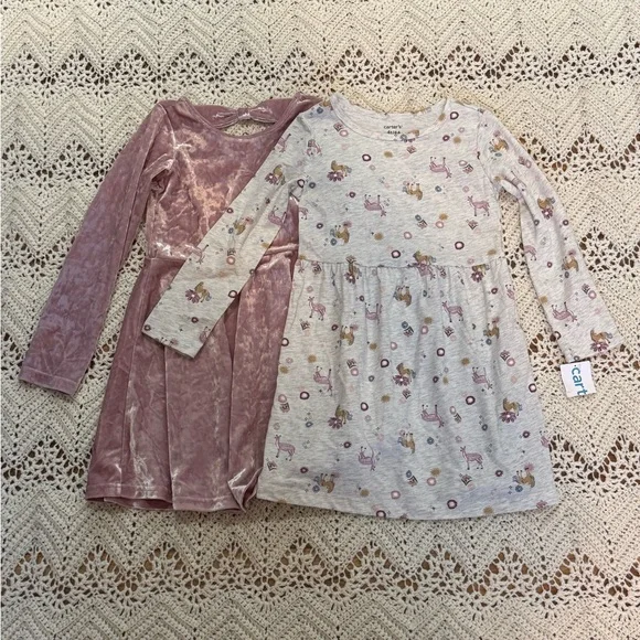The Children’s Place And Carter’s 4T (NWT) Casual PlayTime Dresses. The Children’s Place Dress Is A Velvet Material With A Cross Bow On the Back. The Dress also Has A Small Stain Pictured Above. The Carter’s Dress Displays Unicorns, Flowers, And Suns. The Carters Dress Is New With Tags And Has No Stains.