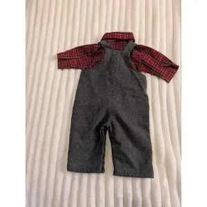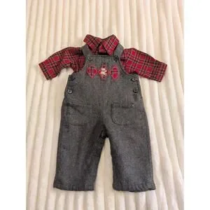 Classic holiday outfit features a long-sleeve red plaid button-down shirt paired with grey wool-blend overalls. The overalls are detailed with an embroidered teddy bear and argyle plaid patches, side button closures, and snap buttons along the inner legs for easy dressing. This charming two-piece set offers a timeless aesthetic perfect for seasonal family photos or festive gatherings.