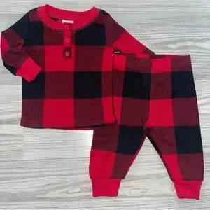 The Children’s Place baby two-piece pajama set, size 0–3 months. Classic red and black buffalo plaid pattern, suitable for baby boys or girls. Soft, comfortable cotton fabric with a long-sleeve top and matching pants. Perfect for cozy sleep, lounging, or holiday photos.