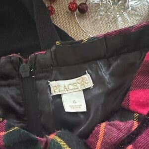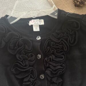 Chic black cardigan with stylish ruffles and pink/black plaid bubble skirt. Skirt has cute ruffle edging and sparkly ribbon around waist area. Perfect for those holiday pictures!