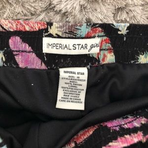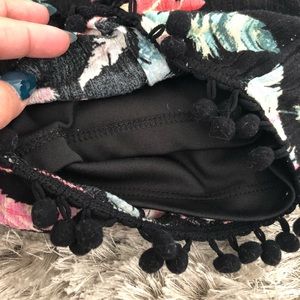 Stylish black top with lace detail. Colorful feather print shorts with pom-pom trim. Perfect for playful days.