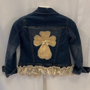 Stylish denim jacket with lace trim. Features button closure and floral accent. Perfect for layering.