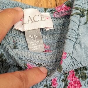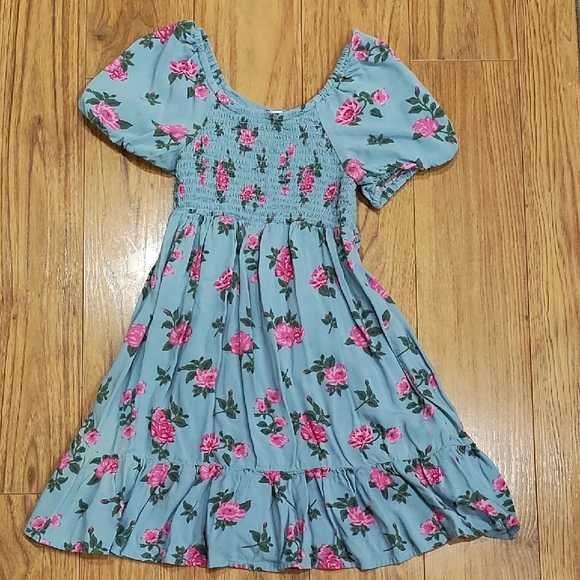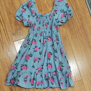 Adorable dress with a floral design. Blue fabric with pink flowers. Perfect for casual outings.
