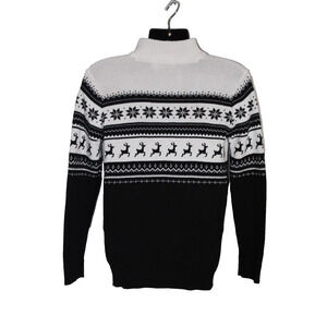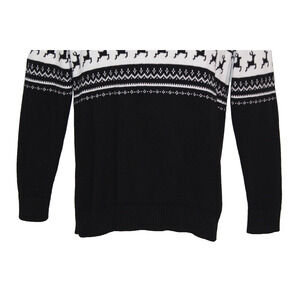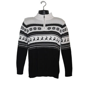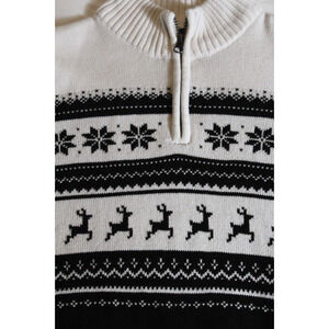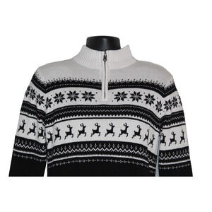 Celebrate the festive season in this Boys XL (Size 14) black and white Nordic-style Christmas sweater. Featuring a charming reindeer and snowflake design with a zip neck for added comfort and style, this sweater is perfect for holiday gatherings or casual wear.