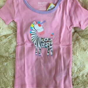 An adorable 2pc pajama featuring a zebra on the top. The set includes a short sleeve top and matching pant bottom.