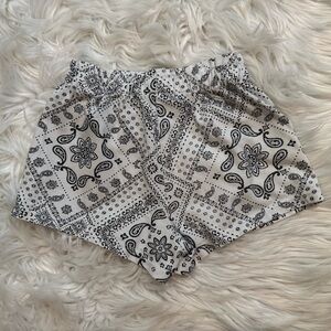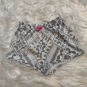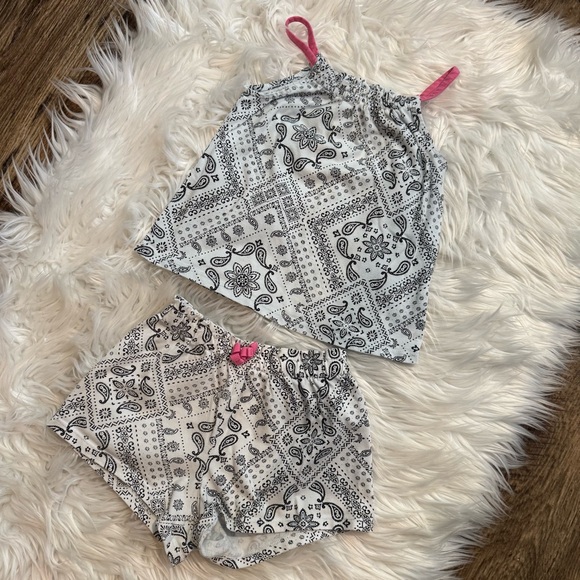 Includes a lightweight bandana-print tank top with pink contrast straps and matching shorts with a pink bow detail.