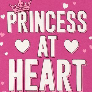 1 graphic tee with 'Princess At Heart' and crown with hearts graphic design at front with glitter