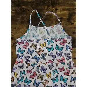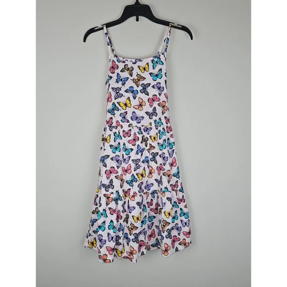 Lightweight jersey knit dress features a vibrant all-over butterfly print in shades of blue, pink, yellow, and purple. Designed with a comfortable tiered skirt and a stylish criss-cross back with thin spaghetti straps, this playful piece is perfect for warm weather outings or casual everyday wear. The soft cotton-blend fabric ensures breathability and ease of movement for all-day play.