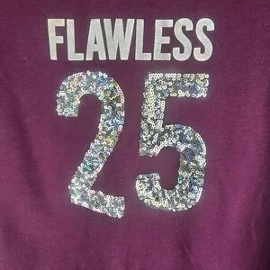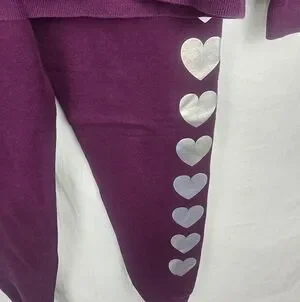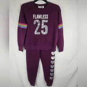 Purple sweatshirt and pants set with 'Flawless 25' design. Features rainbow stripes and silver heart accents.
