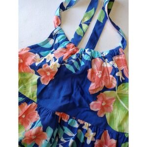 Girls tropical floral maxi dress in blue with coral and green accents. Features a halter neck with tie straps and a tiered ruffled hem. Perfect for a beach vacation or a summer party.
