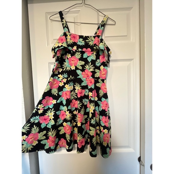 Sunshine ready with this vibrant tropical floral print dress. Adorable ruffle detail along the neckline adds a playful touch, perfect for twirling on a warm day. The sweet and colorful hibiscus and leaf pattern on a black background evokes a playful island vibe. Style this with sandals for a delightful beach outing or a backyard barbecue.