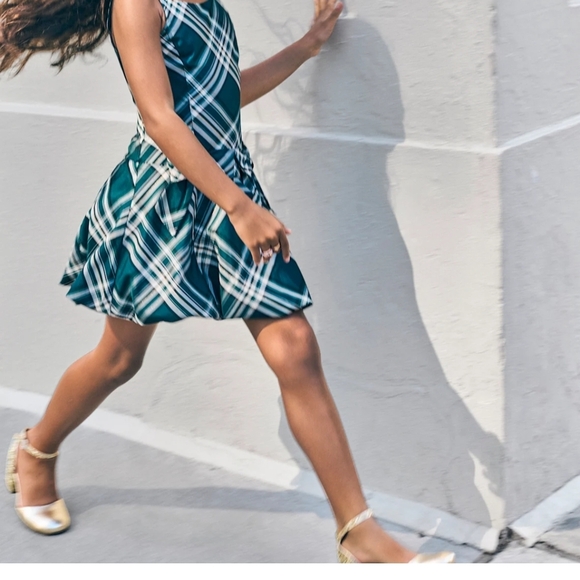 Stylish green plaid dress. Perfect for casual outings. Comfortable and chic.