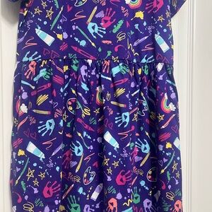 Vibrant dress with playful handprint and doodle design. Comfortable and stylish for everyday wear.