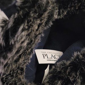 Stylish kids hat with faux fur trim. Features navy and blue colors. Perfect for cold weather.