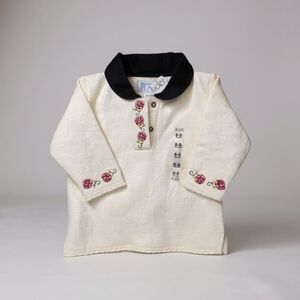 Set of three shirts. Includes pink long-sleeve bodysuit. Cream sweater with black collar and floral details. White short-sleeve shirt with button front.