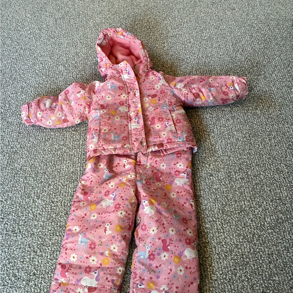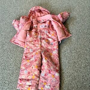 Adorable pink matching set with floral pattern. Includes jacket and pants. Perfect for keeping warm and stylish.