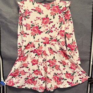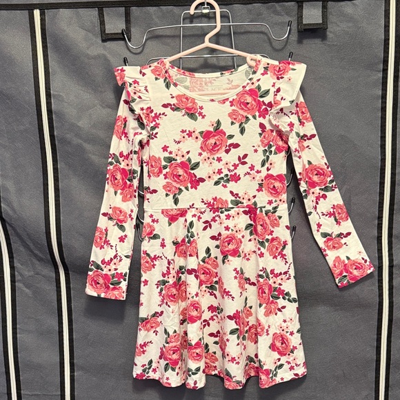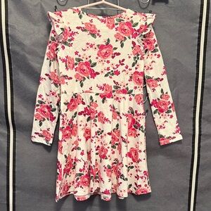 Adorable dress with vibrant floral pattern. Features ruffled shoulders and long sleeves. Perfect for casual outings amor photos.
