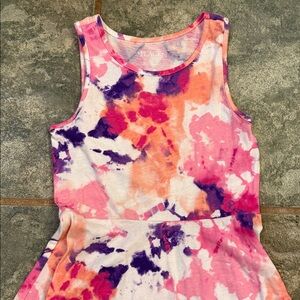 Bright tie-dye dress with pink, purple, and orange. Ideal for casual wear.