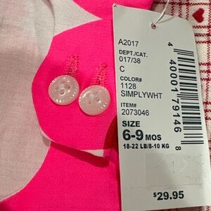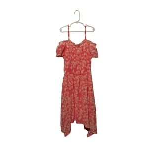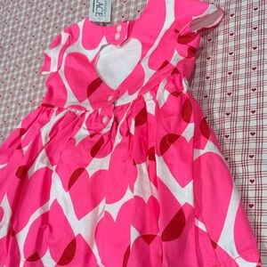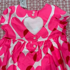 Adorable pink dress with red heart pattern. Short sleeves. Perfect for casual outings.