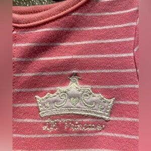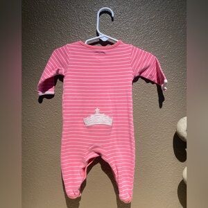 Adorable pink footie with white stripes. Soft fabric for comfort. Small embroidered tiara with ‘lil princess’ on front left and tiara on butt on the back. So cute.
