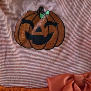 Adorable pumpkin-themed dress. Striped top with playful pumpkin design. Flowy orange tulle skirt adds charm with bow. 12-28 months.