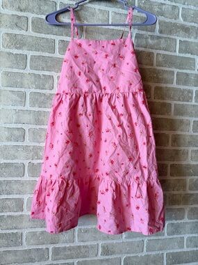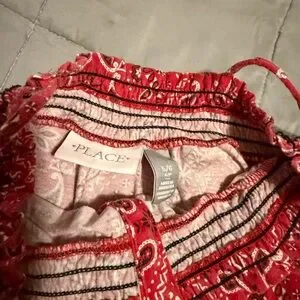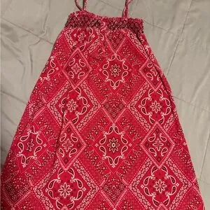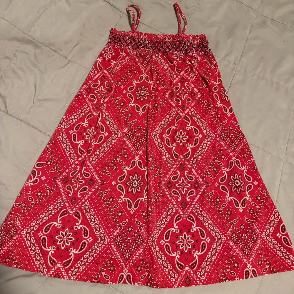 Vibrant red dress with bandana design. Features smocked details and thin straps.